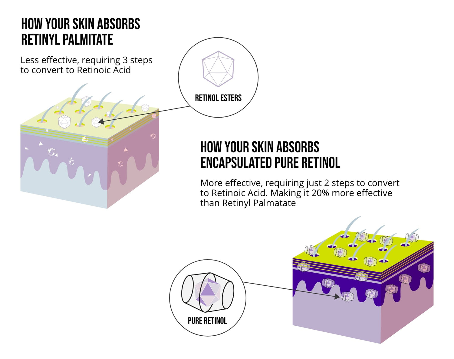 Retinol is the purest form of Vitamin A - 20% more potent than Retinyl Palmatate. It is classed as a first-generation retinoid which, in short, means it is a more effective option as it requires just 2 steps to convert to Retinoic Acid. It can penetrate the stratum corneum (very top layer of skin) more effectively due to its lipophilic (oil-loving) nature.